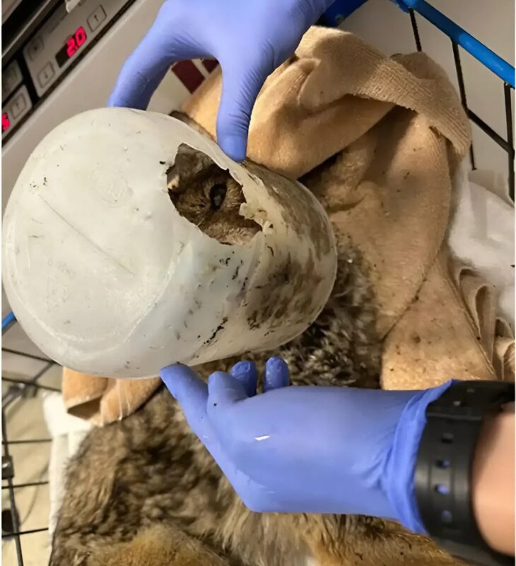 The coyote was in rough shape. Mild hypothermia had set in, and cactus spines littered his fur. Small cuts and bruises revealed the hidden dangers of the floodwaters and debris. The veterinary team worked swiftly, sedating him to carefully remove the bucket and clean his wounds. Fluids, pain medication, and gentle hands made a world of difference.