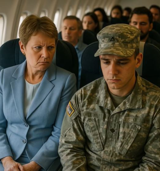 The flight attendant, a woman in her forties named Sarah Mitchell who’d worked this route for fifteen years, pushed her cart down the aisle. She’d noticed the soldier when he boarded—had noticed the purple ribbon on his uniform, the thousand-yard stare, the way he flinched when overhead compartments slammed shut.