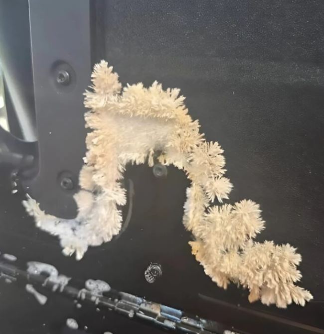 After returning home from visiting my grandmother, I noticed something strange under the back seat of my car. At first, I thought it was just a dried plant, but it turned out to be a growing salt crystal formation—caused by a chemical leak.