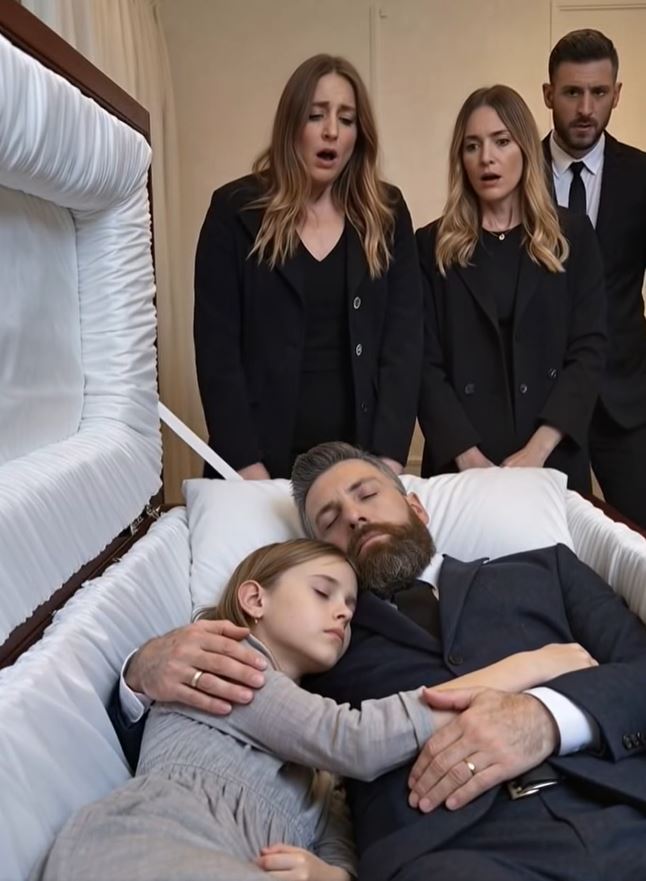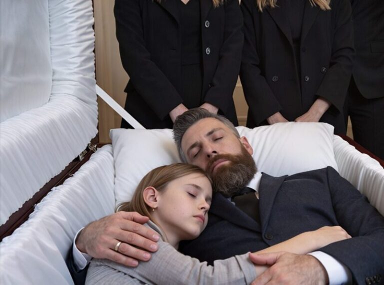 She cautiously climbed into the casket, lay down by her father, then climbed onto the chair without anyone noticing. As though sensing something, she put her arm around him and pressed him close. The adults rushed to the casket as the grandmother shouted upon witnessing this.