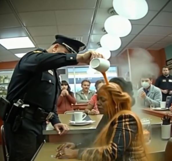 Racist Cop Pours Coffee On Quiet Middle Aged Black Woman Only To Fall To His
